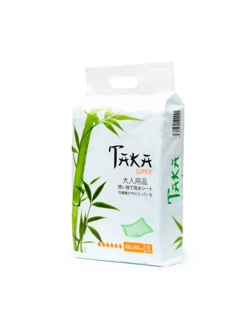 Одноразовые впитывающие пеленки TAKA Супер размером 60х90 см предназначены для гигиенического ухода за лежачими больными, пожилыми людьми с недержанием, а также в послеоперационный период. Пятислойная конструкция с бамбуковой целлюлозой и суперабсорбентом обеспечивает быстрое впитывание, надежную фиксацию влаги в виде геля и защиту от протеканий. Гипоаллергенный верхний слой дарит комфорт, а натуральный бамбук действует как природный антисептик, блокируя запахи и предотвращая раздражение кожи.